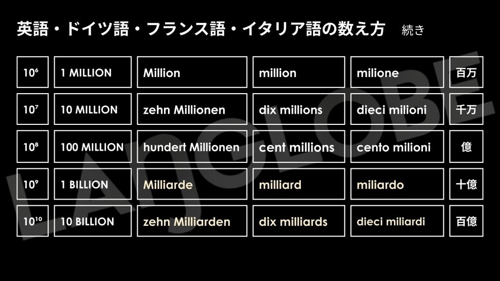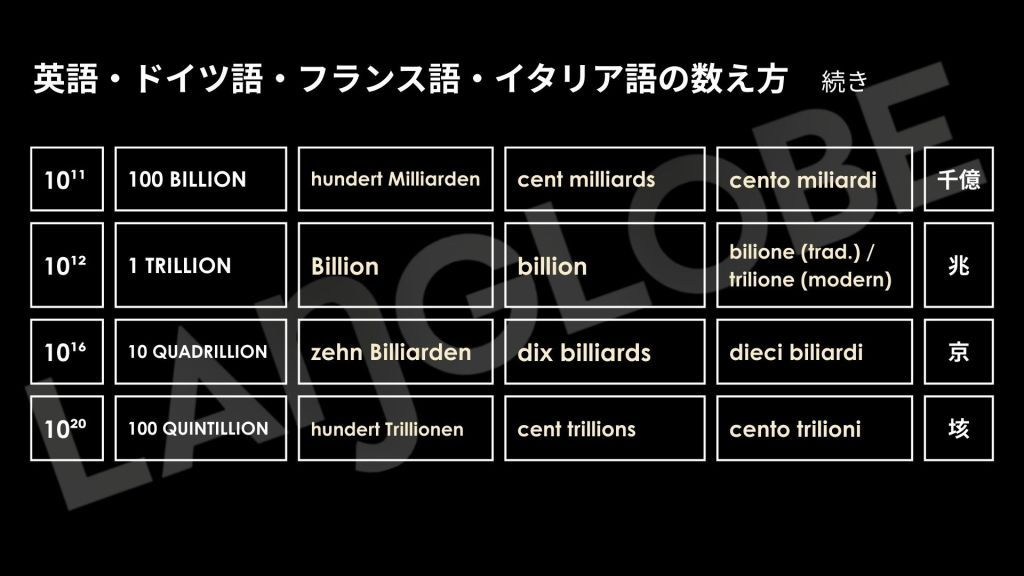 #トリリオン #ビリオン #大きな数 #数の体系 #ショートスケール #ロングスケール #ビリオン対トリリオン #数の呼び方 #数と文化の歴史 #言語比較 #語源 #言語学 #語学学習 #英語 #ドイツ語 #フランス語 #イタリア語 #数学と言語 #LANGLOBE #ラングローブ
